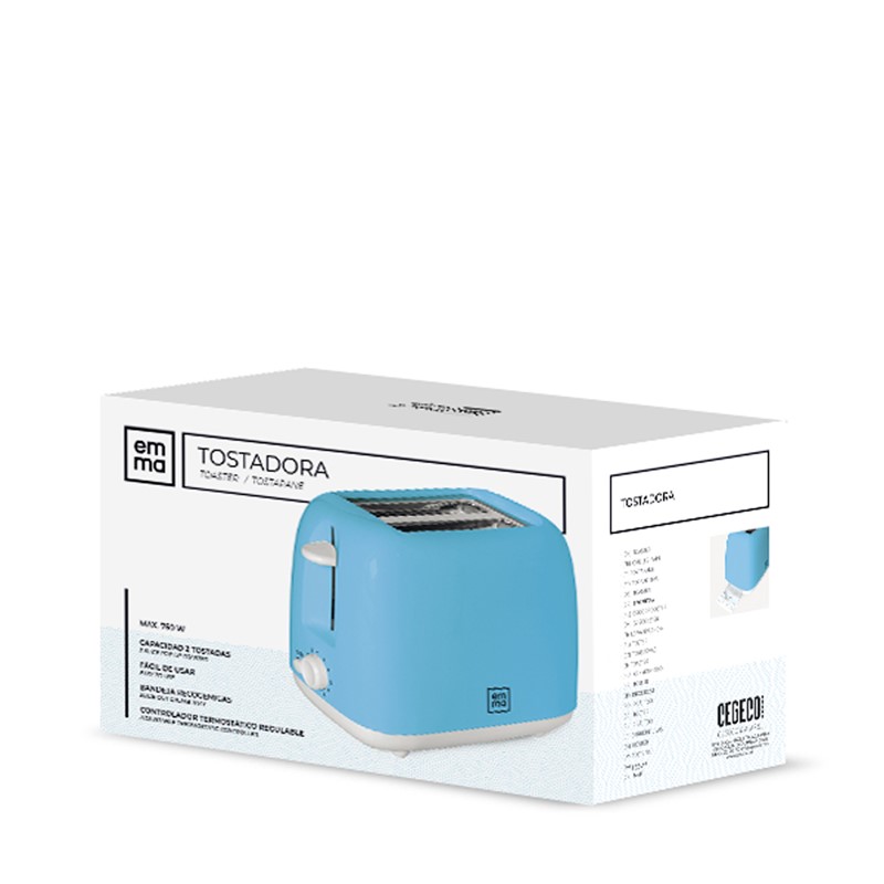 Tostador Emma en color azul, 750W de potencia y tamaño compacto (28×17 cm). Diseño moderno, práctico y resistente para tu cocina.