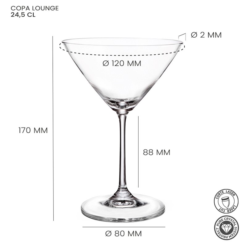 El Juego de 6 Copas Alar Cocktail Lounge ofrece una pieza equilibrada y elegante, diseñada para realzar la presentación de cócteles clásicos y de autor. Su estructura amplia permite una correcta expresión aromática, mientras que el tallo estilizado favorece un agarre seguro y cómodo.
